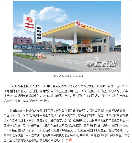 近幾日,湖南部分市州已迅速采取“壓非保民”措施,停止了眾多商家及出租車的燃氣供應。突如其來的氣荒讓大家措手不及。為了確保市場供油穩(wěn)定,讓星城人民溫暖過冬,順暢出行,和順石油積極應對,從山東緊急采購2萬噸國VI標準柴油,專門用于市場保供,切實履行企業(yè)社會責任,同時以優(yōu)惠價格供應市場,絕不借機漲價。